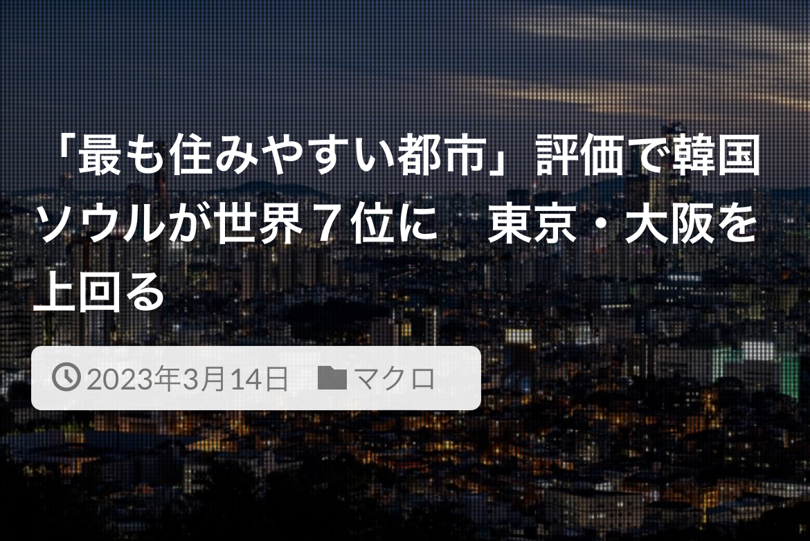 引用元: ・「最も住みやすい都市」評価で韓国ソウルが世界7位に 東京・大阪を上回る[3/14] [首都圏の虎★]