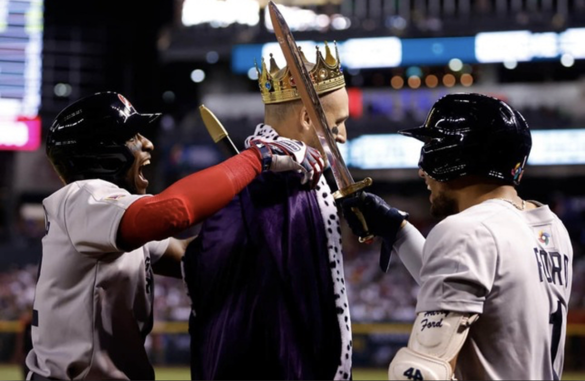 (アメリカ出身)が先制のソロホームランを放つと、ベンチでは王冠とマントを持ったチャベス・ヤング選手(バハマ出身)がお出迎え。