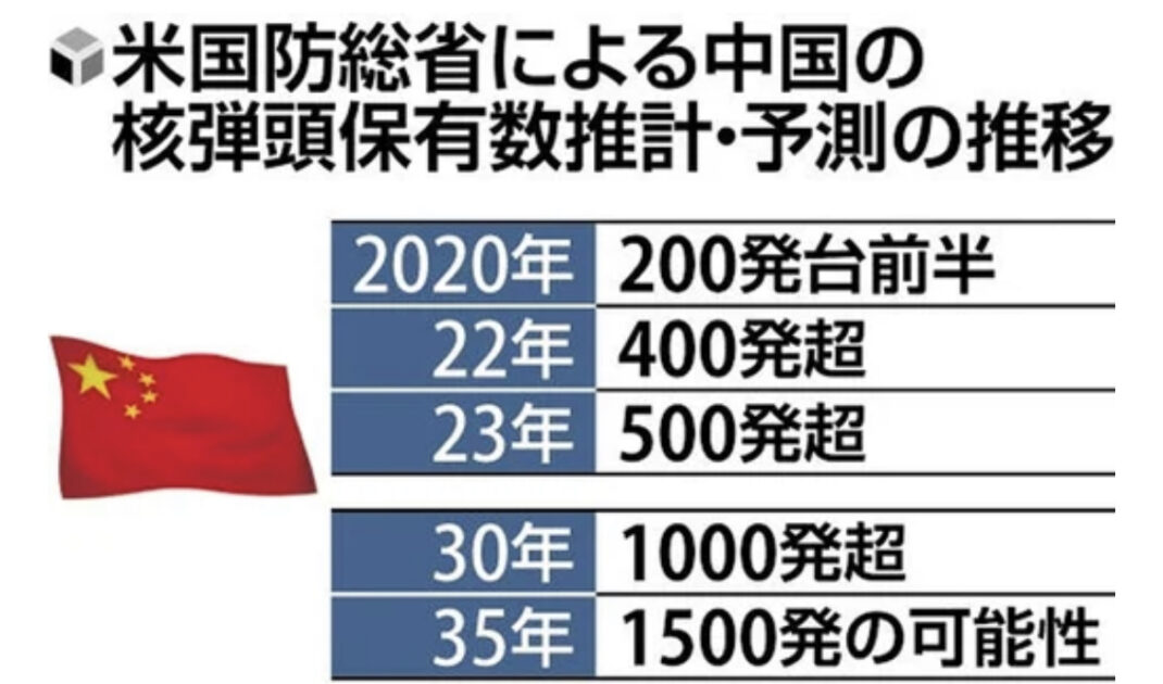 中国は核弾頭保有数を公表していない。20年の報告書は保有数を200発台前半と推計し、30年までに倍増すると見通していた。今回の報告書は「事前の予測を超えている」と懸念を示した。(略)