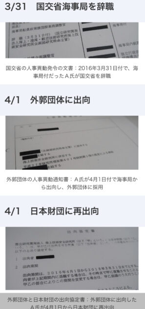 2カ月後に開示された文書には、噂話を裏付けるような記載があった。海事局のある職員の場合、人事異動の記録を突き合わせてみると、いったん外郭団体の「海上・港湾・航空技術研究所」(東京)に出向。同じ日、外郭団体から日本財団に再出向していた。