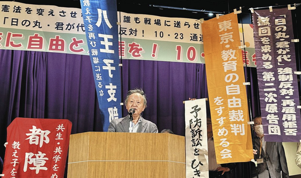 「生徒の卒業を祝福する卒業式が『日の丸・君が代』が主人公の卒業式に変質したことを思い出す」。22日に東京・日比谷で開かれた集会で、主催団体の一つ「『日の丸・君が代』不当処分撤回を求める被処分者の会」の近藤徹事務局長が述べた。