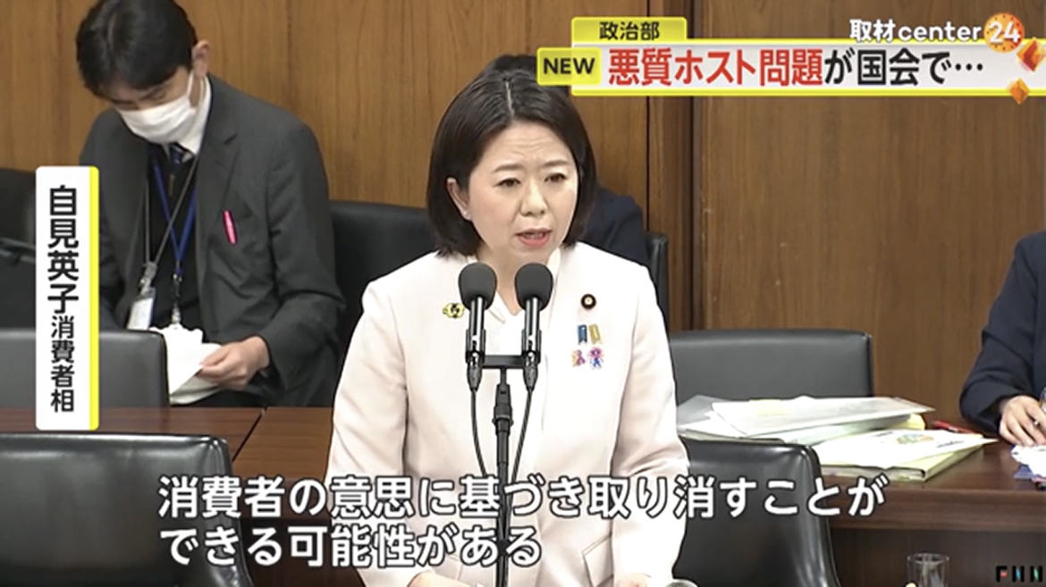 自見英子消費者相「好意の感情などを不当に利用した契約、いわゆるデート商法につきましては、(消費者契約法4条で)取り消し権を定めていて、悪質なホストクラブの手法が定める要件に該当すれば、消費者の意思に基づき取り消すことができる可能性がある」