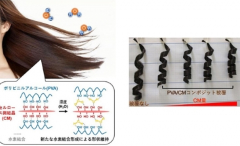 ポリビニルアルコール/セルロース微結晶(PVA/CM)コンポジット材料による湿度応答性形状記憶ヘアスタイリング効果(物質・材料研究機構提供)