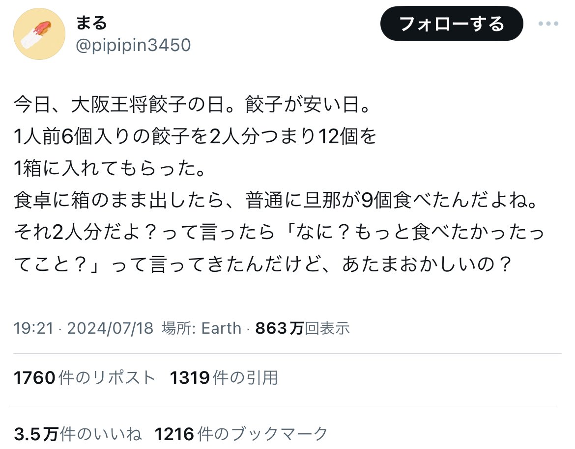 2024年7月、そんな趣旨の投稿がX(旧ツイッター)にアップされ、表示回数が800万件を超える注目を集めました。この手の「食い尽くし系」と呼ばれる行為に及ぶのは男性が多いようで、類似のケースとして「ちょっと食べていい? って聞かれてOKしたらカレーの具ほとんど食べられてルーしか残ってなかった」「作り置きのおかずが子どものお弁当用に取っておいたものも全部食べてしまう」などの愚痴がXにはあふれています。