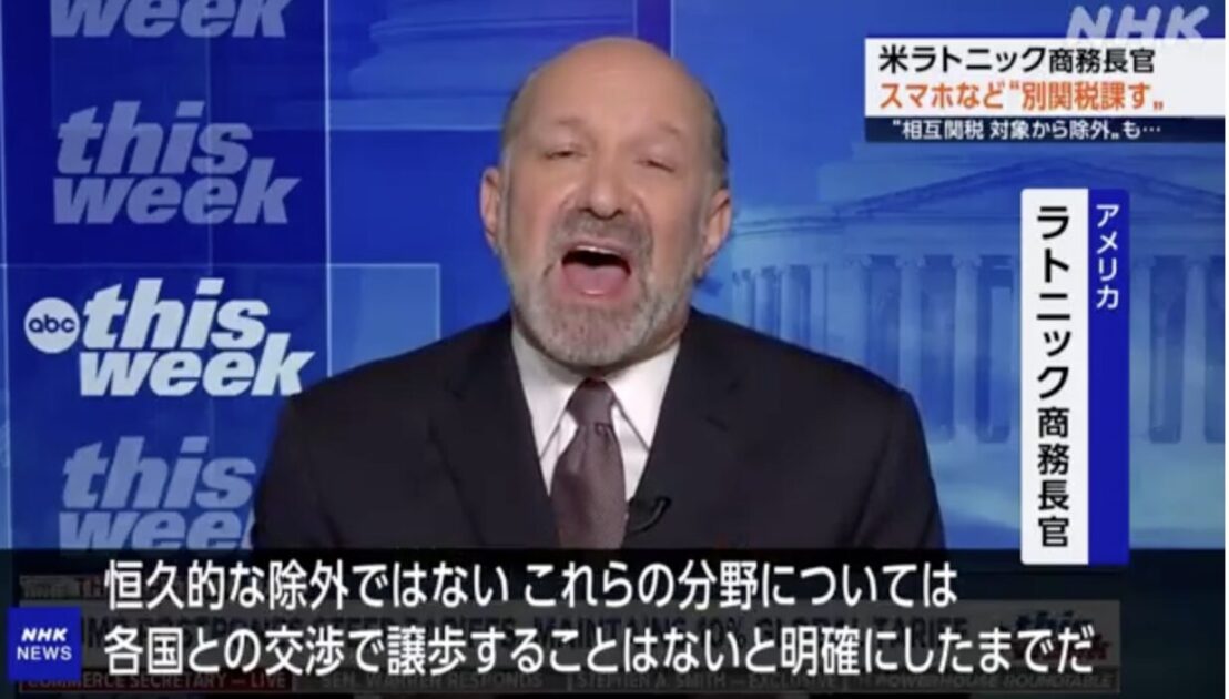 【ワシントン共同】ラトニック米商務長官は13日、米ABCテレビに出演し、「相互関税」から除外したスマートフォンなどは、今後導入する分野別の「半導体関税」に含まれるとの見解を示した。
