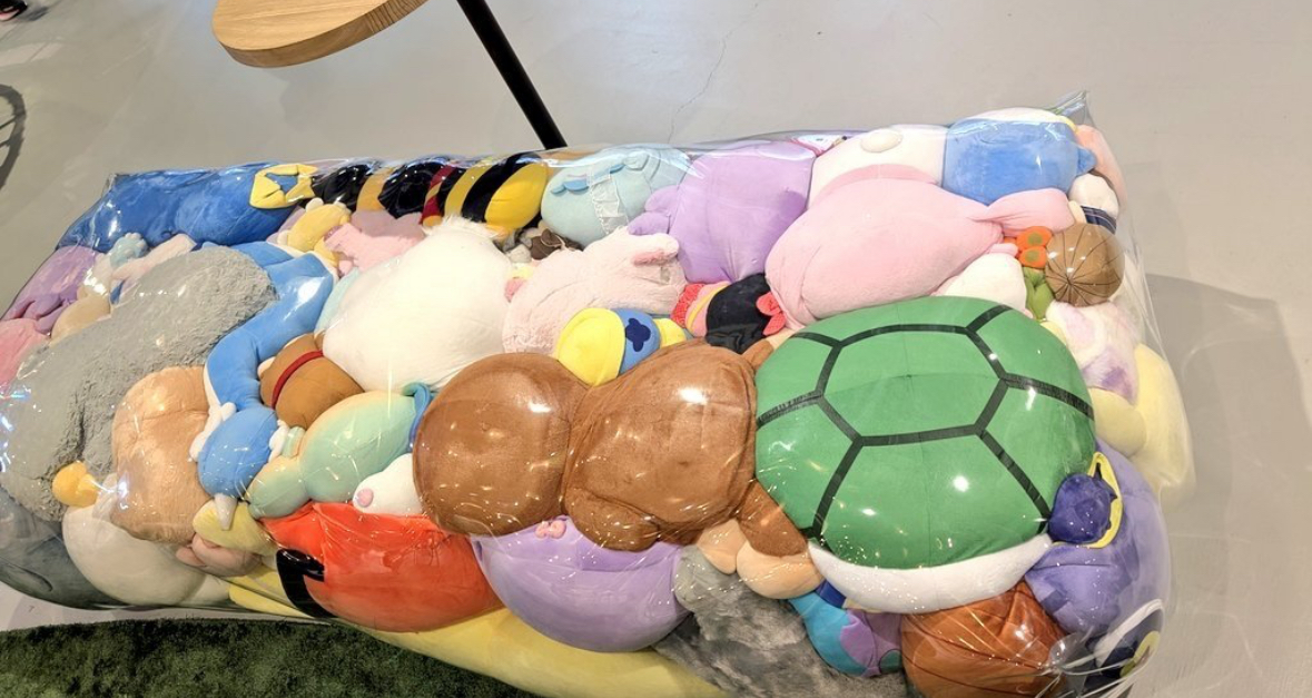 同社が《遊ばれなくなったぬいぐるみたちに、次の役割を与えたいという想いからつくられたアップサイクル家具です》と説明するそのベンチは、同社運営の室内型アミューズメントパーク『ASOBLE(アソブル)』ゆめが丘ソラトス店に置かれていたもの。