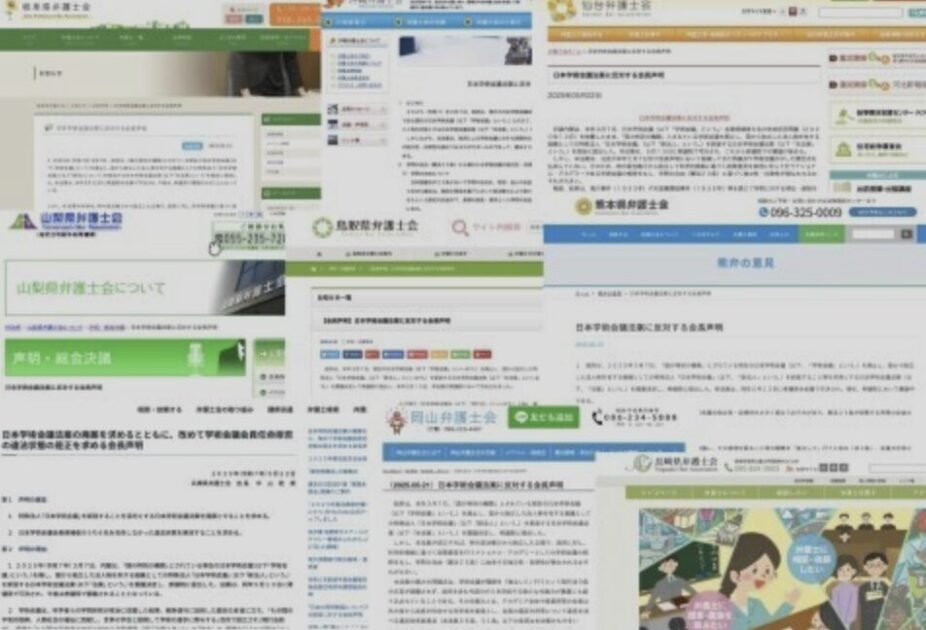 兵庫県弁護士会は「廃案」を明確に要求し、沖縄弁護士会は戦前の学問弾圧(滝川事件、天皇機関説事件)への言及とともに「極めて重大な問題」と指摘。仙台弁護士会は「戦後80年を迎えるときに廃止されることに強い危惧」を表明した。