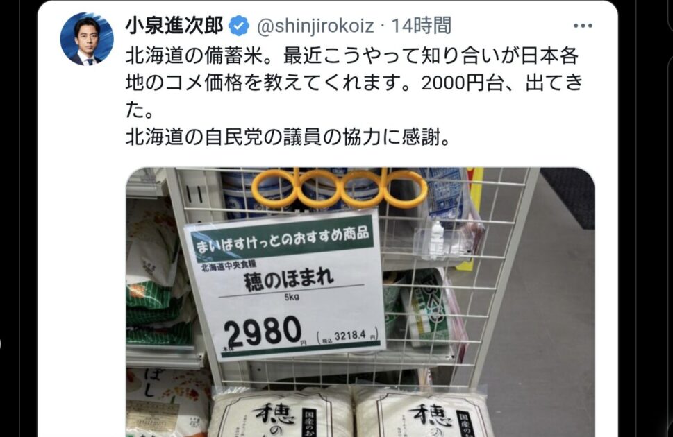 25日、小泉農林水産大臣は公式Xに「北海道の備蓄米。最近こうやって知り合いが日本各地のコメ価格を教えてくれます。2000円台、出てきた。北海道の自民党の議員の協力に感謝」と、実際に店舗に置かれている米の写真をポスト。