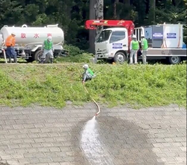 ため池に給水車で注水。雨が降るまで少しでも足しになるように現場とともに乗り越えます!現場に感謝。