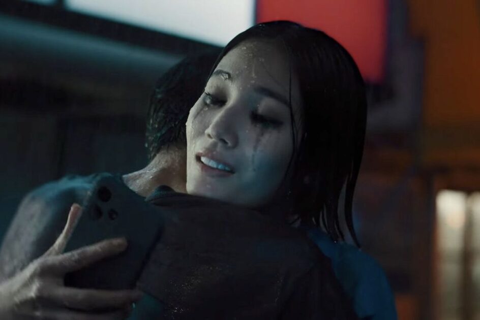 突然の雨だったのか、公衆電話のボックスに雨宿りで逃げ込む女性。そこにおそらく恋仲にある男性が通りかかる。雨の中で抱き合う男女。雨なので女性のマスカラが流れ落ち、ホラー映画か、はたまた大御所のハードロックバンドのメイクのよう。