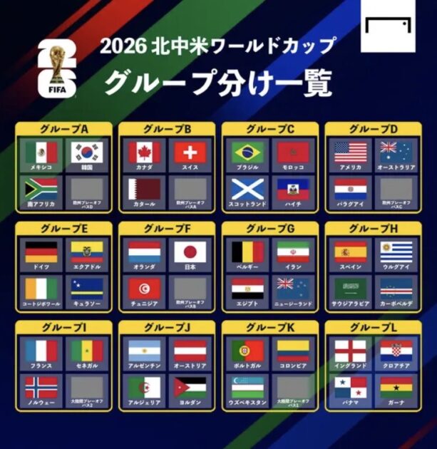 引用元: ・【サッカー】2026年北中米W杯の組み合わせが決定! 日本代表はオランダ、チュニジア、欧州プレーオフB勝者と同組で激突 [久太郎★]