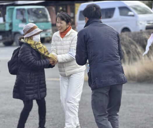選挙戦4日目の1月30日午前11時前。群馬県藤岡市の「コープぐんま藤岡店」に、参政党の選挙カーが横付けされた。車からスタッフたちが飛び降り、慌ただしくオレンジ色の幟を立て始める。