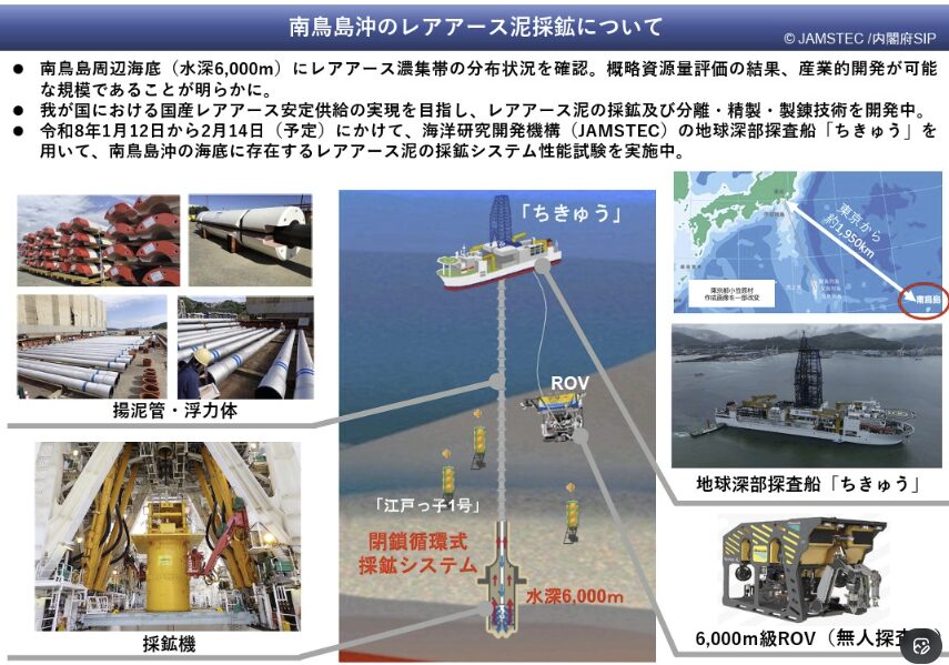 本日、文部科学省が所管する海洋開発研究機構(JAMSTEC)の探査船「ちきゅう」を用いて、水深6,000mからレアアース泥を揚泥することに成功したと一報がありました。