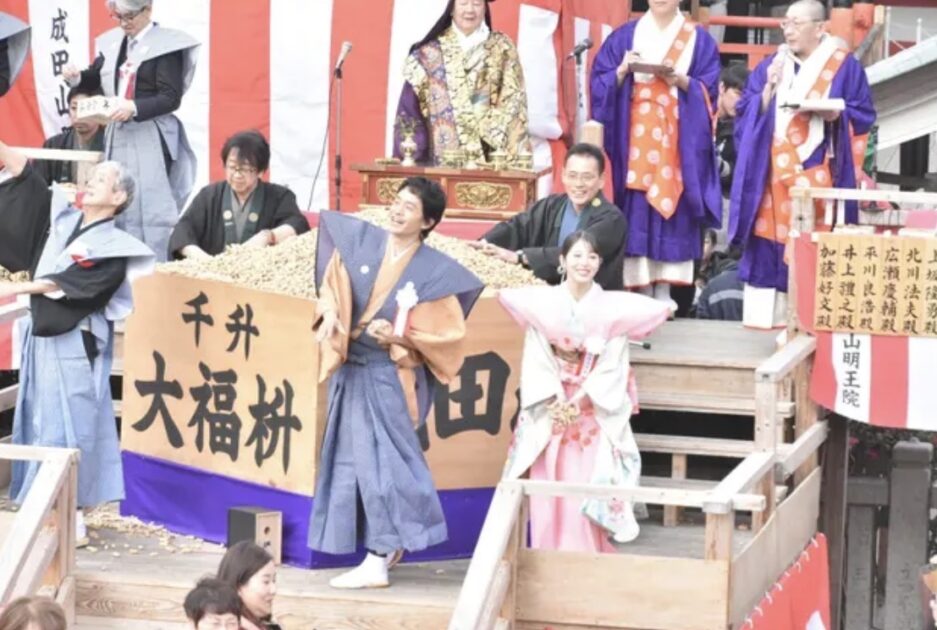 参拝客から「寧々様~」と声が掛かる中、特別参加年男として巨大な千升大福枡から落花生をまいた2人。池松は学生時代の野球経験を生かした見事な投球を披露し、豆まき用に区切られたエリアの外側まで落花生を届かせて大歓声を浴びた。浜辺はその飛距離に驚き、関係者から「いい肩してますね~」とほめられ、照れ笑いを浮かべる場面も見られた。