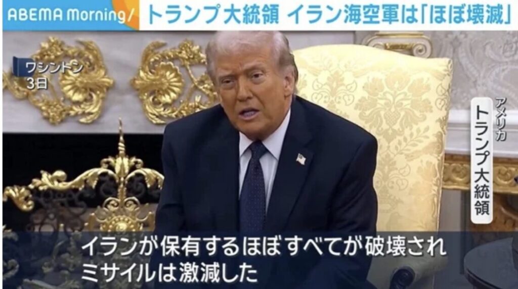 1: 夜のけいちゃん ★ 2026/03/04(水) 09:38:43.18 ID:B2oUQyrv9 3/4(水) 8:27配信 ABEMA TIMES アメリカのトランプ大統領は、これまでの攻撃によってイランの海軍や空軍をほぼ壊滅させ、防空能力を喪失させたと主張しました。 トランプ大統領「我々の攻... -