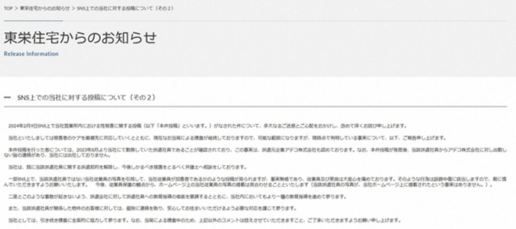 東栄住宅「性的投稿」行ったのは派遣社員だった 公式HPで声明、法的措置検討 従業員の私物に体液を…