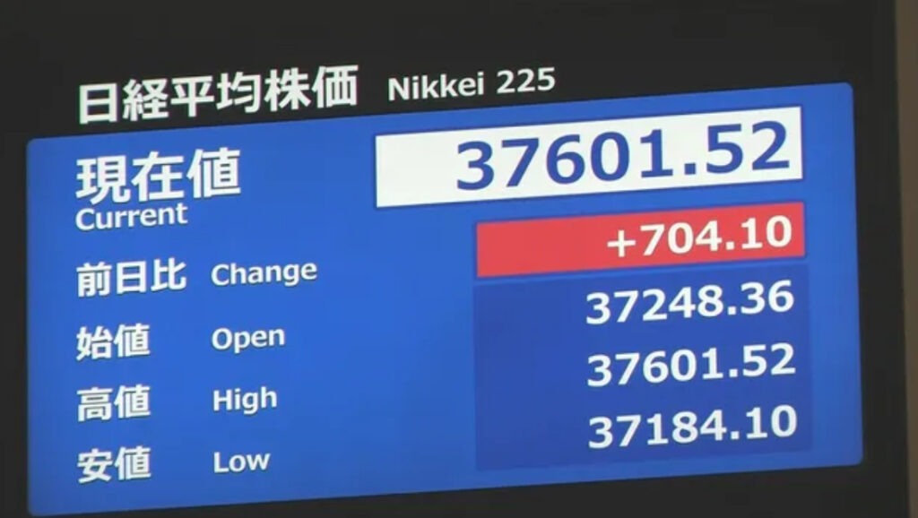 【速報】日経平均一時600円超値上がり バブル後最高値を更新 3万7500円超