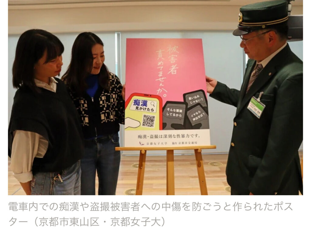 1: テイラー ★ 2024/02/10(土) 19:56:05.26 ID:??? TID:taylor 京都女子大(京都市東山区)の学生が京都市交通局と協力し、痴漢などの性犯罪被害者に対する第三者からの中傷を防ぐポスターを制作した。本来は責められる立場にない被害者の服装や行動を非難... -