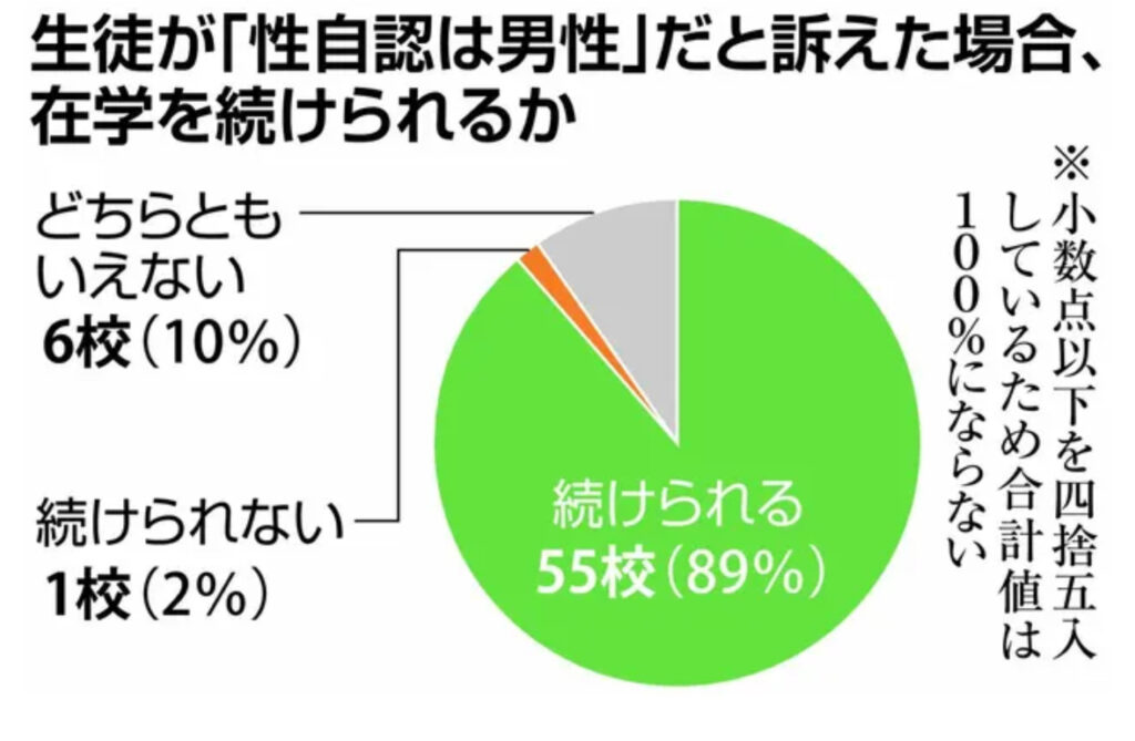 1: 首都圏の虎 ★ 2024/02/10(土) 14:21:06.65 ID:h7fZseJk9 戸籍上は男性でも女性だと自認しているトランスジェンダーの生徒をめぐり、首都圏と近畿圏にある私立女子中学校・高校のうち、少なくとも14校が受験や入学を認めるかどうかを検討していること... -