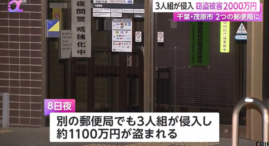 1: 首都圏の虎 ★ 2024/02/10(土) 09:31:51.01 ID:4Vhrrmd49 千葉・茂原市で2カ所の郵便局に3人組が相次いで侵入し、あわせて2,000万円が盗まれた。 8日夜、茂原市の郵便局に3人組が侵入し、およそ900万円が盗まれた。 1時間半後にも通報があり、市内の別の... -