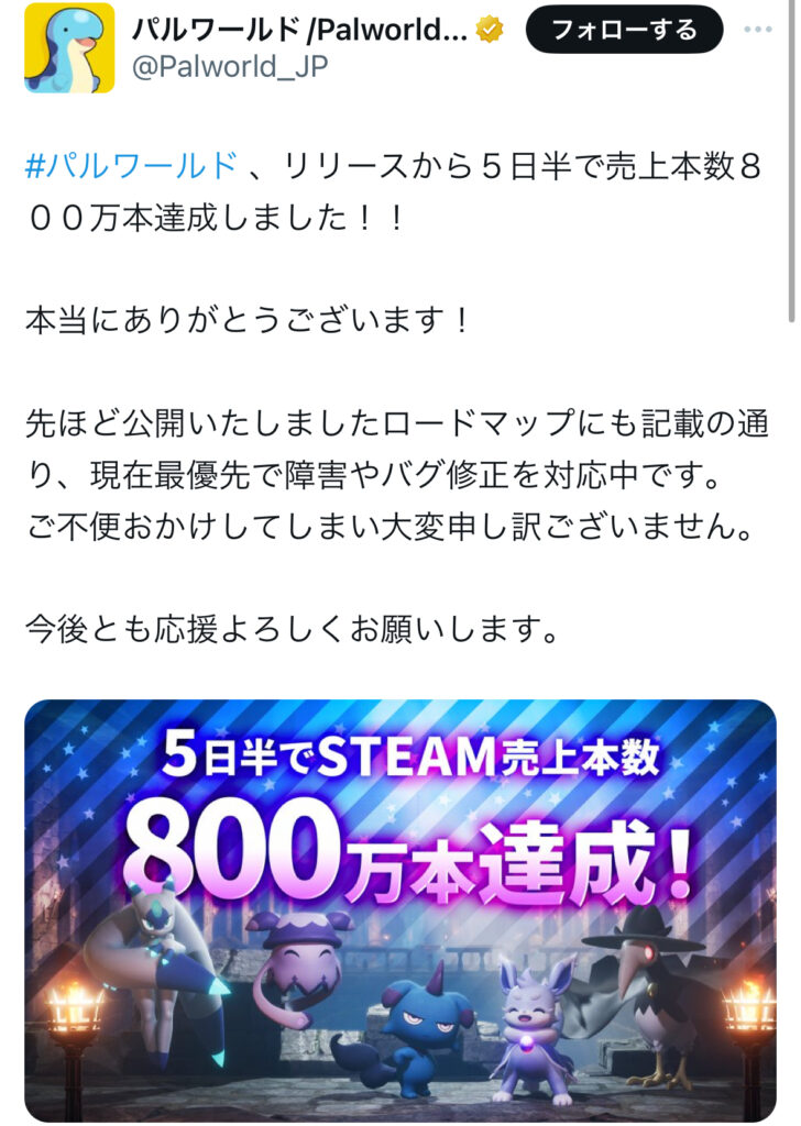 1: 爆笑ゴリラ ★ 2024/01/25(木) 12:28:24.70 ID:Ge9no6Wf9 パルワールド/Palworld 公式 @Palworld_JP #パルワールド 、リリースから5日半で売上本数800万本達成しました!! 本当にありがとうございます! 先ほど公開いたしましたロードマップにも記... -