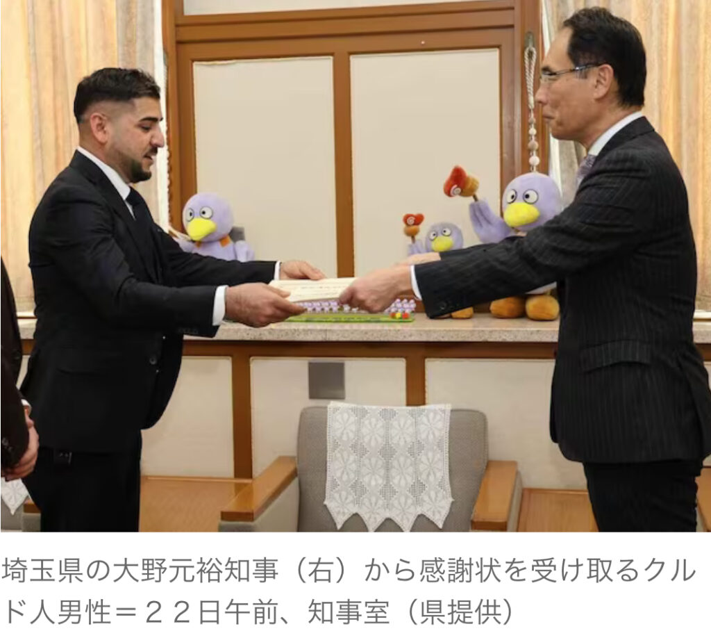 不法滞在のクルド人男性に埼玉県の大野知事が感謝状 難民申請中に100万円寄付 – 産経