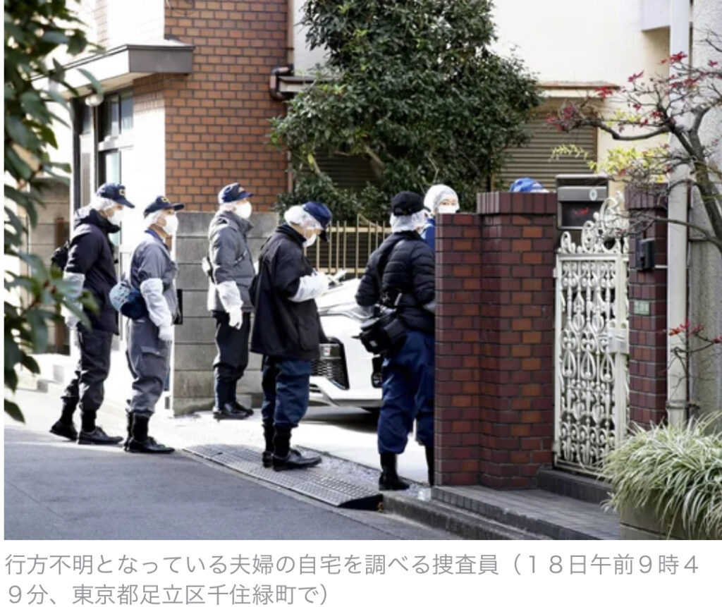 1: 夢みた土鍋 ★ 2024/01/18(木) 21:00:23.61 ID:??? TID:dreampot 東京都足立区に住む50歳代の夫婦が16日夜から行方不明となり、警視庁が18日午後に自宅内を調べたところ、床下から夫婦とみられる2人の遺体が見つかったことが捜査関係者への取材... -