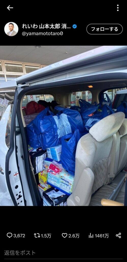 れいわ・山本太郎議員、アルファードにパンッパンの支援物資を積み被災地に乗り込んでいた