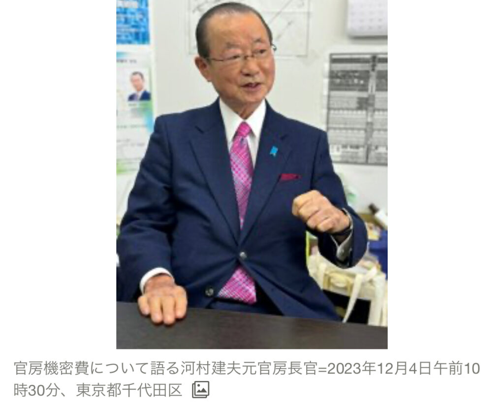 1: BFU ★ 2023/12/04(月) 21:52:00.49 ID:8776t2CA9 内閣官房報償費(官房機密費)の使い道について、河村建夫元官房長官が4日、朝日新聞の取材に応じ、在任中に「陣中見舞いとして持って行くことがあった」と語り、選挙向けに支出していたことを明らかに... -
