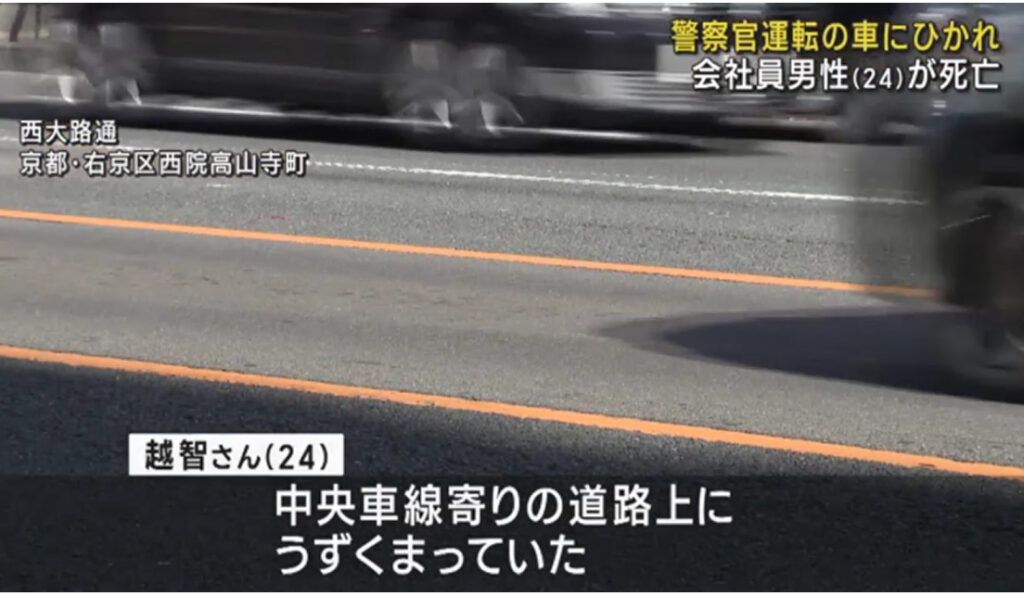1: ばーど ★ 2023/12/04(月) 07:41:29.63 ID:MPnMOVqd9 2日未明、京都市右京区で、車道でうずくまっていた若い男性が警察官の運転する車にひかれ、死亡しました。 2日午前0時すぎ、京都市右京区の西大路通で、会社員の越智幸久さん(24)が車にひ... -