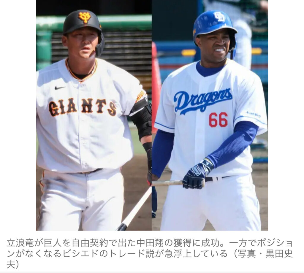 1: Ailuropoda melanoleuca ★ 2023/12/04(月) 07:47:25.91 ID:DeI8HTny9 12/4(月) 6:00配信 巨人を自由契約になった中田翔(34)の中日移籍が決定的となった。中日にとって待望の大型補強だが、出場機会を求めてオプトアウト契約を行使して巨人を去った中... -