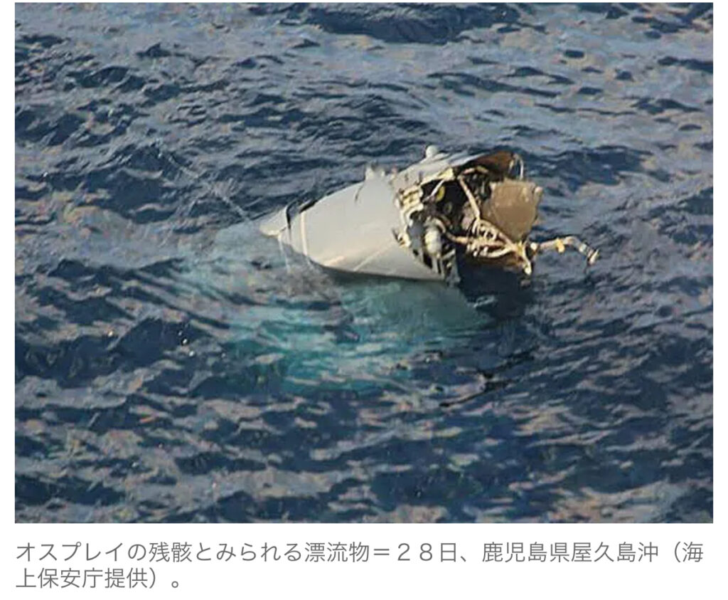 1: 夜のけいちゃん ★ 2023/11/30(木) 17:29:07.01 ID:ElqI3UB99 11/30(木) 17:00配信 夕刊フジ 鹿児島県・屋久島沖で29日、墜落したとみられる米空軍横田基地(東京)所属の輸送機CV22オスプレイについて、日本政府は、搭乗員の救助に全力を挙げつつ... -