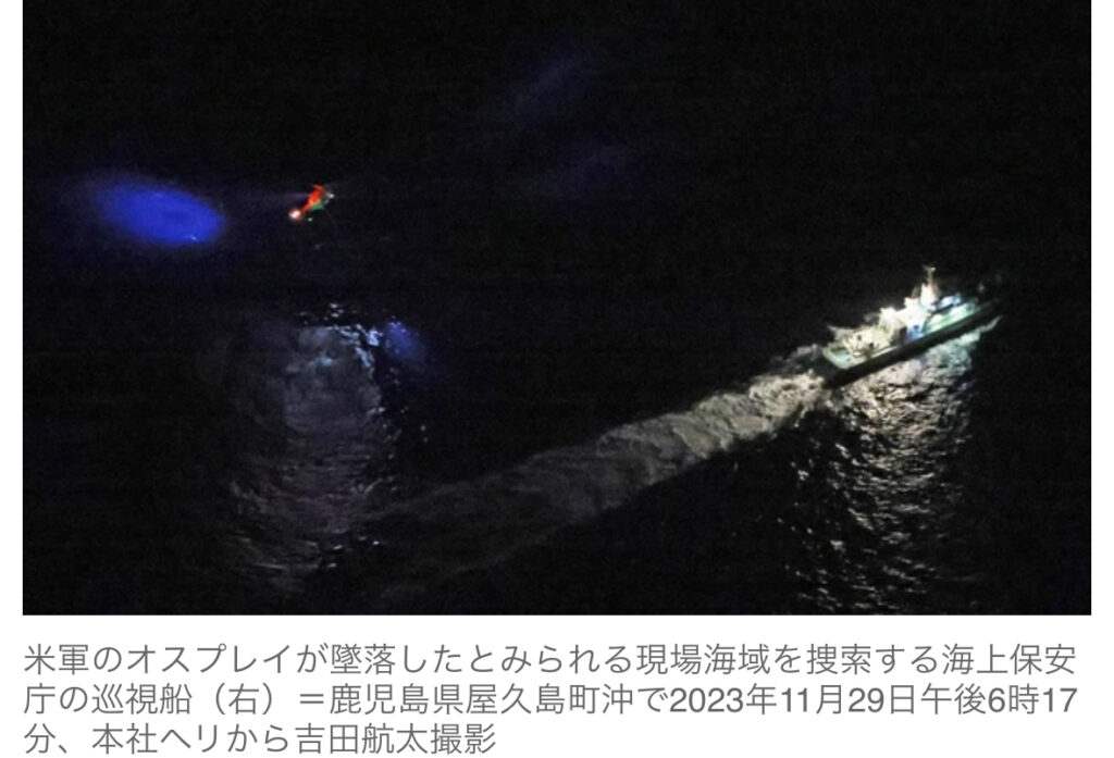 1: ばーど ★ 2023/11/29(水) 20:23:11.28 ID:nfbuvV1s9 宮沢博行副防衛相は29日、米軍オスプレイが鹿児島・屋久島沖で墜落したとみられる事故を受け、防衛省で記者団に対し、事故機が米軍横田基地所属のCV22オスプレイで、海上保安庁の巡視船が乗員1人を...
