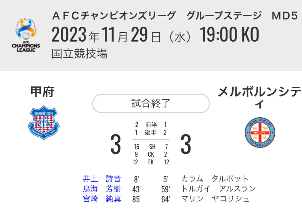 1: 久太郎 ★ 2023/11/29(水) 20:58:33.95 ID:3nl5ePpP9 甲府 3-3 メルボルン・シティ [得点者] 05'カラム タルボット (メルボルン) 08'井上 詩音 (甲府) 43'鳥海 芳樹 (甲府) 59'トルガイ アルスラン(メルボルン) 64'... -