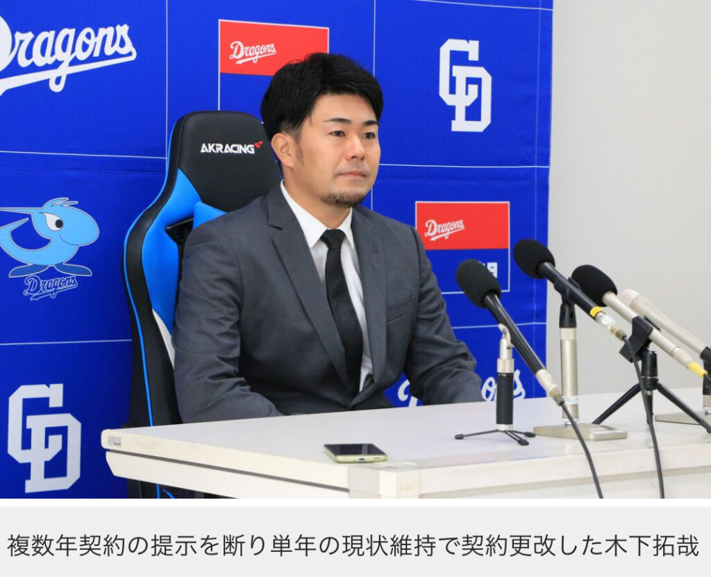1: Ailuropoda melanoleuca ★ 2023/11/28(火) 11:11:26.16 ID:/GaqxEOJ9 2023年11月28日 11時3分 中日の木下拓哉捕手が28日、ナゴヤ球場内で契約更改交渉に臨み、球団から複数年契約を提示されたものの、単年契約を選択して現状維持の6800万円でサ... -