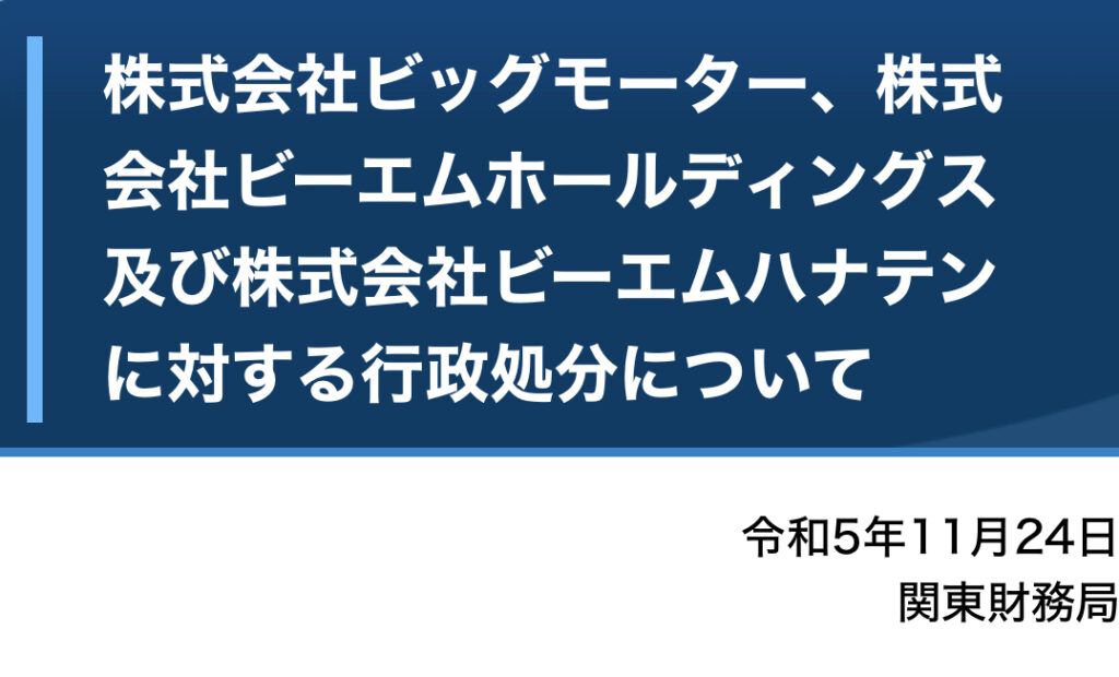 1: おっさん友の会 ★ 2023/11/27(月) 21:24:24.10 ID:fFznZi419 関東財務局は、本日、株式会社ビッグモーター(本社:東京都多摩市、法人番号:9250001011590)、株式会社ビーエムホールディングス(本社:東京都多摩市、法人番号:9120001183229)及び株... -
