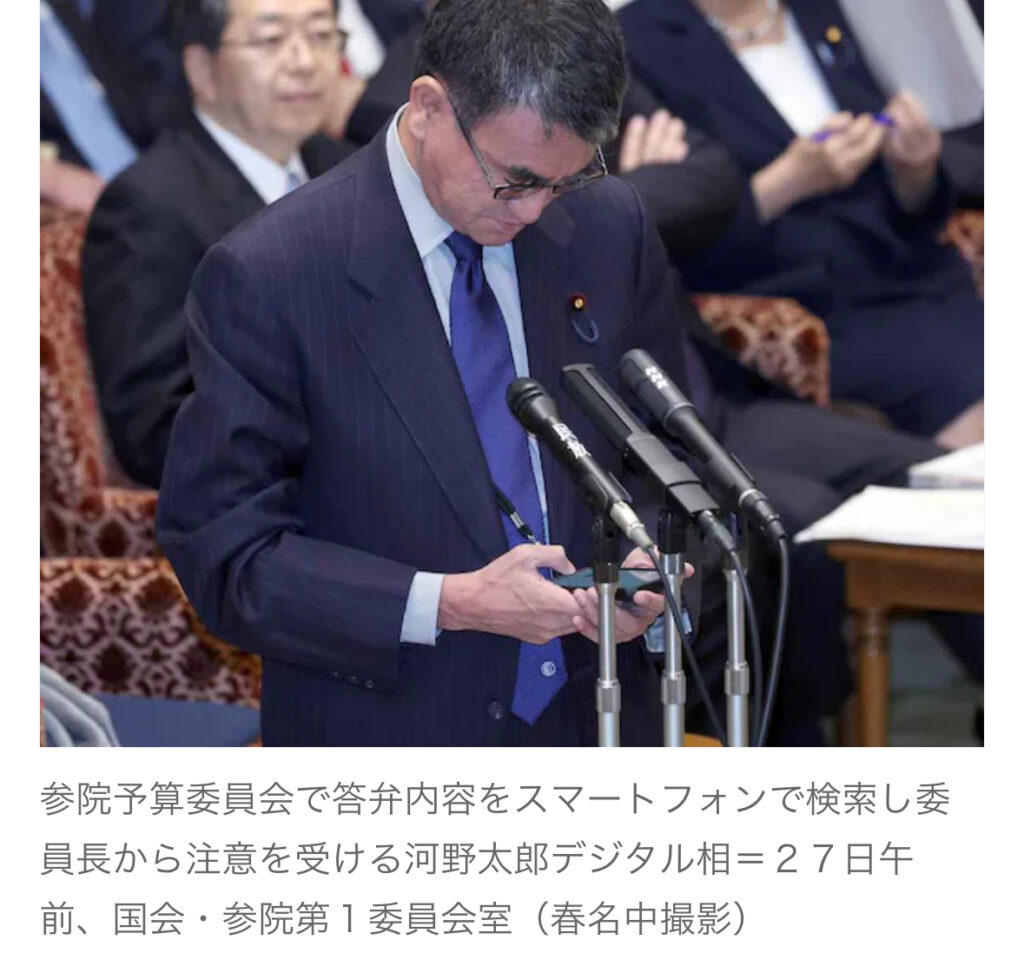 1: ちょる ★ 2023/11/27(月) 12:27:03.83 ID:??? TID:choru 27日の参院予算委員会で、河野太郎デジタル相がスマートフォンで調べながら答弁しようとして、末松信介委員長から注意される一幕があった。 一般ドライバーが自家用車を使い有償で客を運ぶ「ラ... -