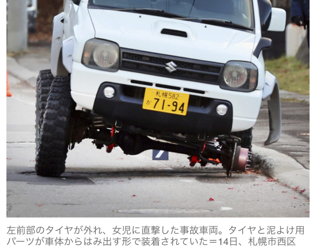 1: ばーど ★ 2023/11/25(土) 19:20:11.74 ID:Wi+xAE4G9 札幌市西区の市道で軽RVのタイヤが脱落し、直撃を受けた女児が意識不明の重体になった事故で、事故車両が8月の車検合格後に不正に改造され、法令上は公道走行が認められない状態だった疑いがあること... -