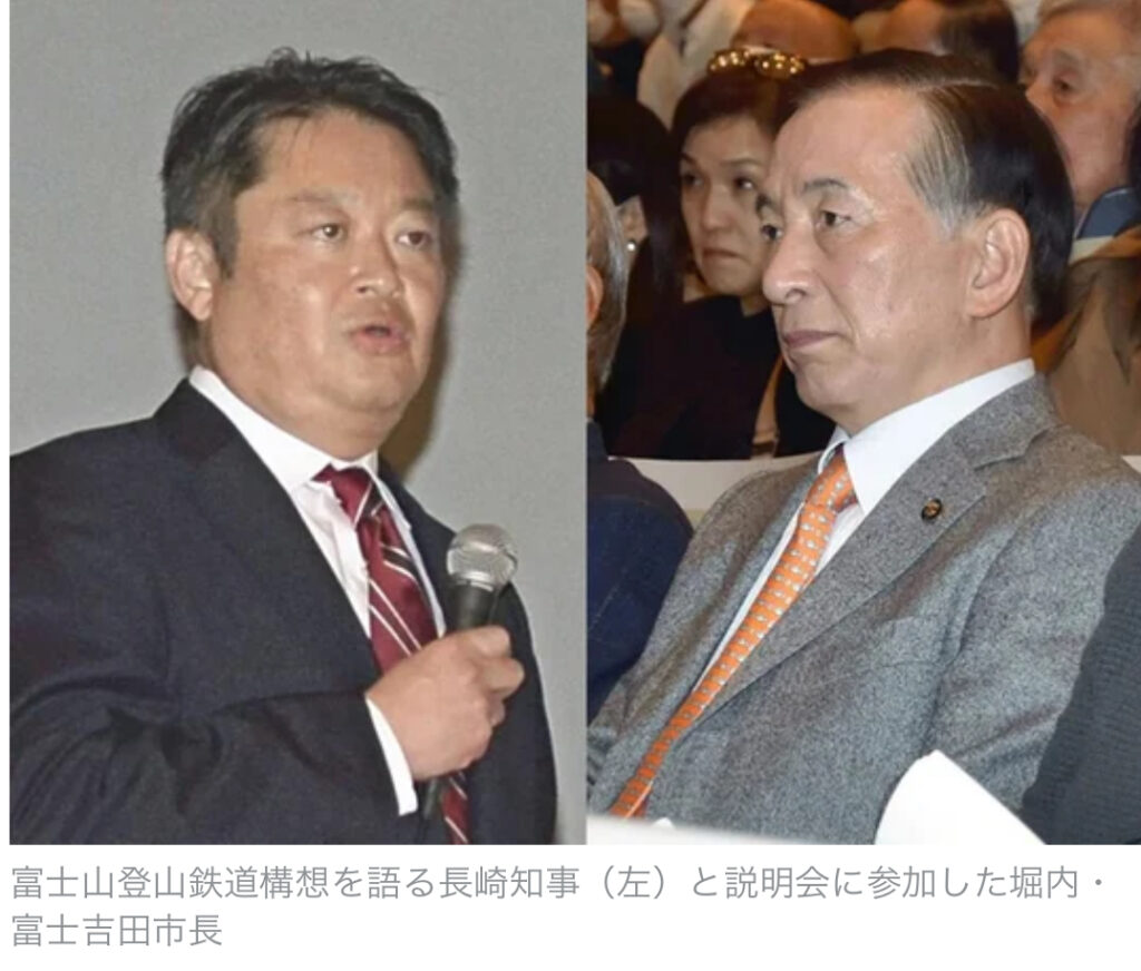 1: ばーど ★ 2023/11/24(金) 12:07:11.05 ID:XBUn2km69 山梨県が掲げる富士山登山鉄道構想の住民説明会が23日、富士吉田市で開かれ、長崎知事が肝いりの構想を約45分にわたって語った。反対を表明している堀内茂市長も会場に姿を見せたが、発言に立つ... -