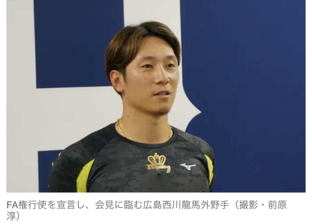 1: ひかり ★ 2023/11/14(火) 13:07:49.75 ID:P6pwI4zl9 広島西川龍馬外野手(28)がFA権を行使することが14日、球団から発表された。西川はマツダスタジアム内で会見に臨み、昨季取得したFA権行使についての心境を語った。 ◇ ◇ ◇ -FA権... -