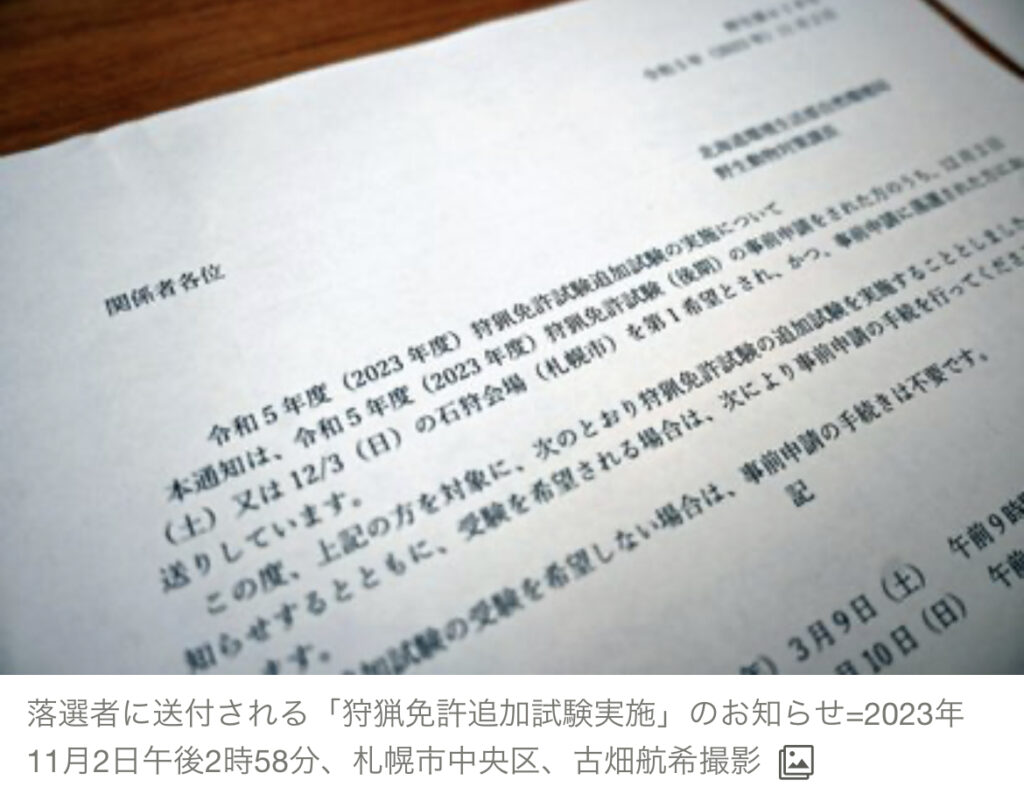 1: 朝一から閉店までφ ★ 2023/11/12(日) 18:12:31.36 ID:t/1Xh90w 古畑航希2023年11月3日 7時00分 北海道は2日、狩猟免許試験を受けるために行った抽選の落選者に対し、追加試験を実施すると決めた。 ヒグマやエゾシカなど野生動物とのあつれきが増し、... -