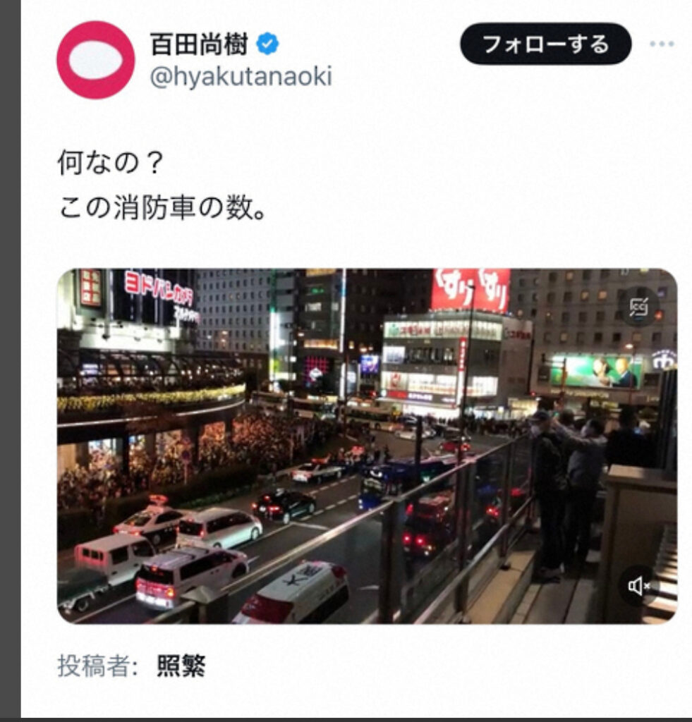 1: Hitzeschleier ★ 2023/11/12(日) 19:59:09.10 ID:uk0qWfk89 日本保守党の百田尚樹代表らが11日に大阪・梅田のヨドバシカメラ前で街頭演説。演説には大勢の聴衆が集まり、パトカーや消防車など緊急車両が集まる騒ぎとなったため、始まってすぐに警察の... -