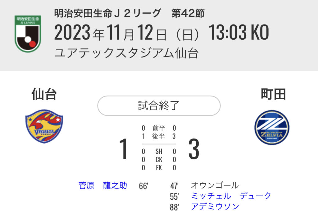 1: 久太郎 ★ 2023/11/12(日) 15:03:43.10 ID:0CXCZlxE9 仙台 1-3 町田 [得点者] 47'オウンゴール (町田) 55'ミッチェル デューク(町田) 66'菅原 龍之助 (仙台) 88'アデミウソン (町田) スタジアム:ユアテックスタジ... -