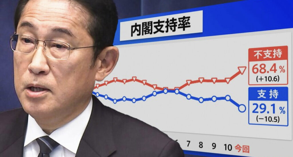 1: テイラー ★ 2023/11/11(土) 10:33:18.95 ID:??? TID:taylor JNNが行った最新の世論調査で岸田内閣の支持率が先月の調査から10ポイント以上、下落。政権発足後、初めて30%を切り、過去最低となった。 11月2日に経済対策をとりまとめた直後の調査...