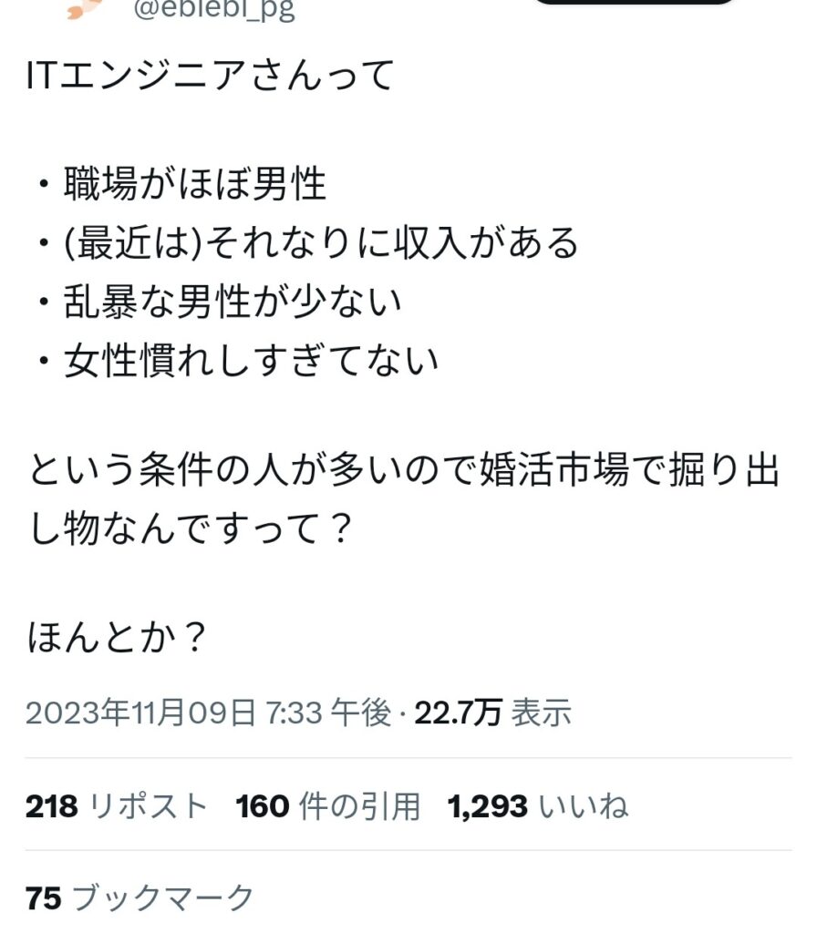 1: 名無しさん@涙目です。(東京都) [CN] 2023/11/11(土) 01:49:38.77 ID:mEqawl4n0● BE:237216734-2BP(2000) sssp://img.5ch.net/ico/tona1.gif https://xtech.nikkei.com/atcl/nxt/column/18/02638/110800001/ 引用元: ・ITエンジニア男への婚活女性から... -