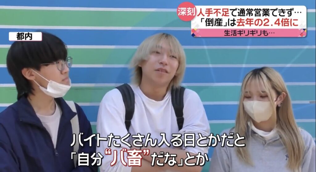1: テイラー ★ 2023/11/10(金) 07:32:01.52 ID:??? TID:taylor 人手不足を理由とした企業の倒産が、去年の2倍以上になっているというデータが9日、発表されました。そうした中、若者たちの間では「バ畜(ばちく)」という言葉が広がっています。 9日午前... -