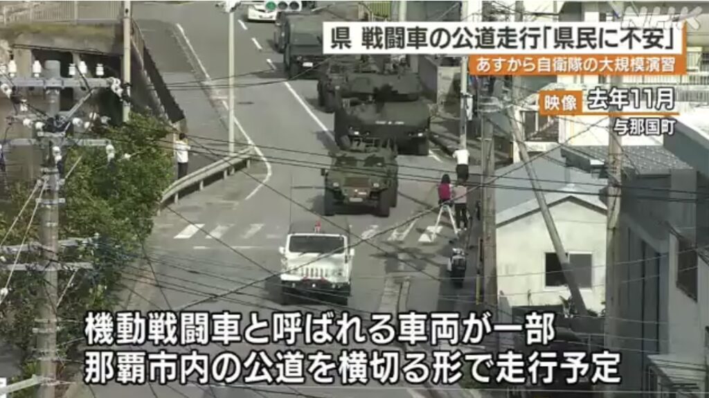 1: 少考さん ★ 2023/11/09(木) 21:27:05.52 ID:320Py2yk9 機動戦闘車の公道走行 県が沖縄防衛局に懸念伝える|NHK 沖縄県のニュース https://www3.nhk.or.jp/lnews/okinawa/20231109/5090025601.html 11月09日 20時59分 10日から行われる自衛隊の大規模... -