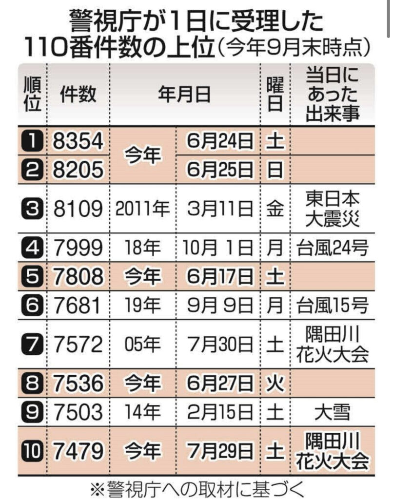 【東京】警視庁、1日の110番通報が東日本大震災当日を上回り過去最多 6月24日に8354件 その要因は