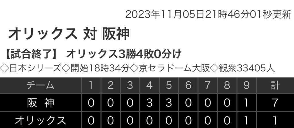 1: 鉄チーズ烏 ★ 2023/11/05(日) 21:44:08.95 ID:3fIPjpTA9 阪神 0 0 0 3 3 0 0 0 1|7 オリックス. 0 0 0 0 0 0 0 0 1|1 【バッテリー】 (阪)青柳、島本、伊藤将、桐敷、岩崎 - 坂本 (オ)宮城、比嘉、小木田、...