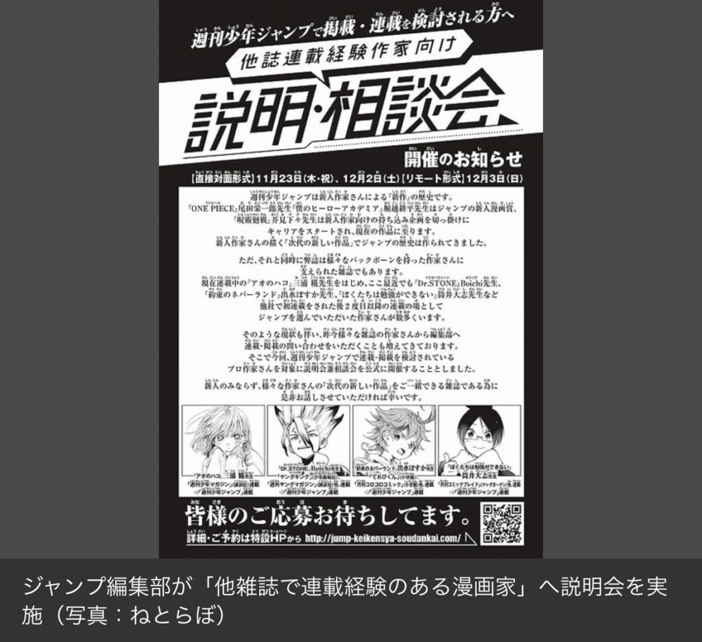 1: KOU ★ 2023/11/05(日) 23:09:49.22 ID:??? TID:kougou 少年ジャンプ編集部は、他雑誌で連載経験のある漫画家を対象にした連載・掲載説明会の開催を発表。その際に公開した原稿料について、注目が集まっています。説明会はリモート開催も含めて11月23日... -